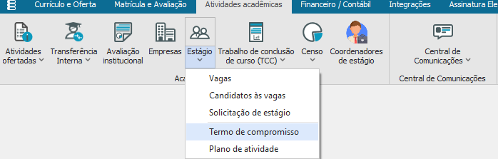 O Lançamento do Termo de Compromisso ocorre no “Módulo Educacional- Educacional” aba “Atividades Acadêmicas” opção “Estágio- Termo de Compromisso”