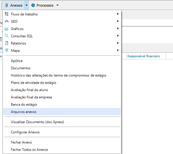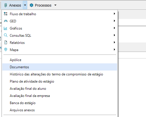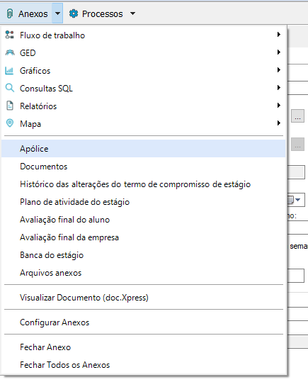 Para realizar a vinculação da apólice de seguro do estágio, selecione a opção “Anexos- Apólice”