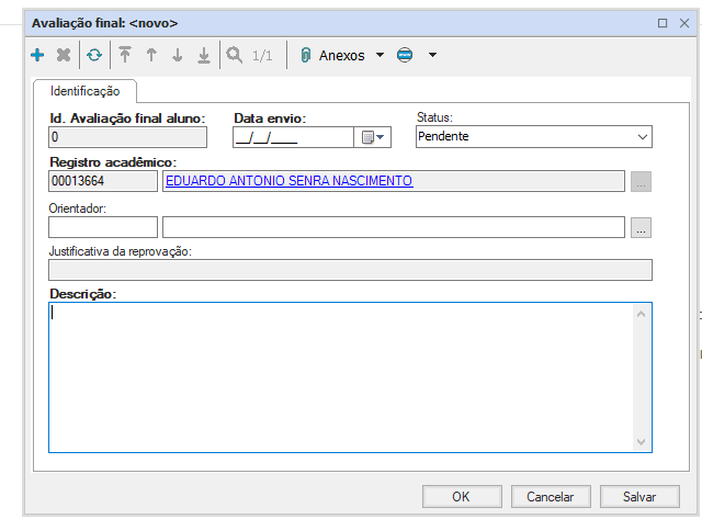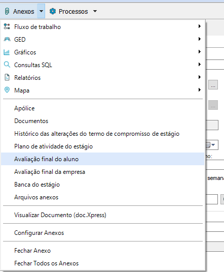 A opção “Anexos- Avaliação Final do Aluno” tem como objetivo realizar a aprovação do termo de compromisso, com as horas de estágio realizadas