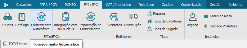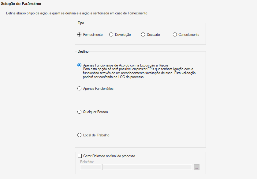Este parâmetro permite a associação do EPI para um ou mais funcionários, e do EPC para um ou mais locais de trabalho. O fornecimento é feito automaticamente, primeiro escolhendo as pessoas, em seguida, os destinos e os EPI/EPC´s.