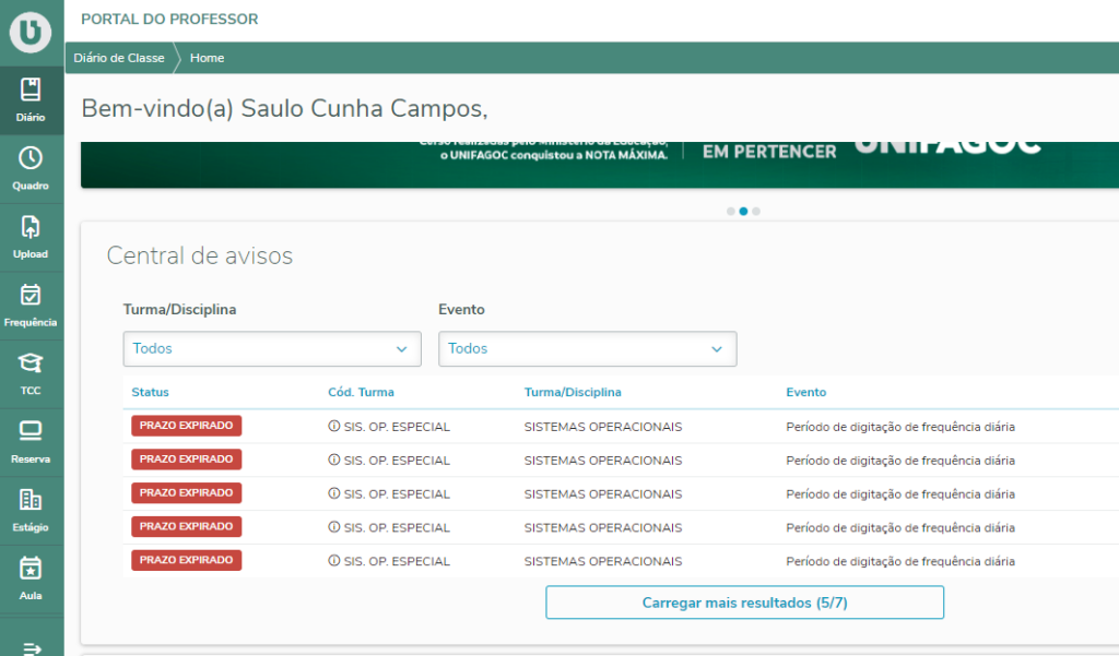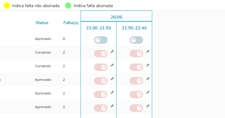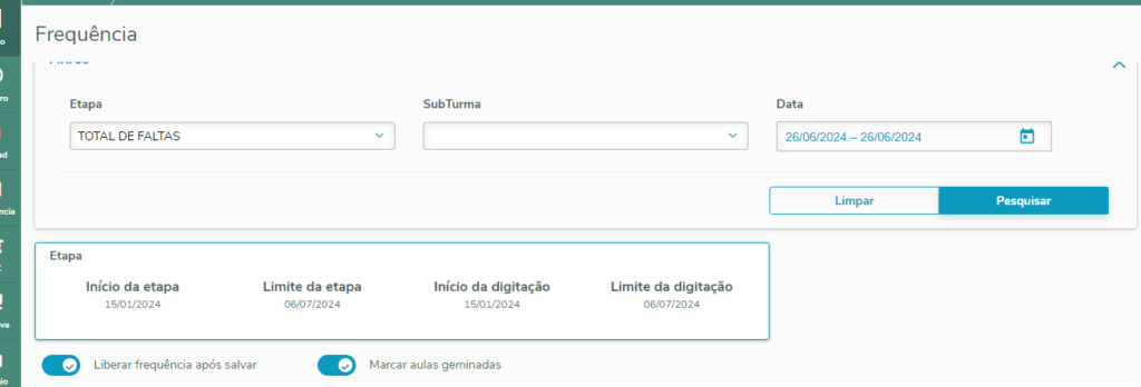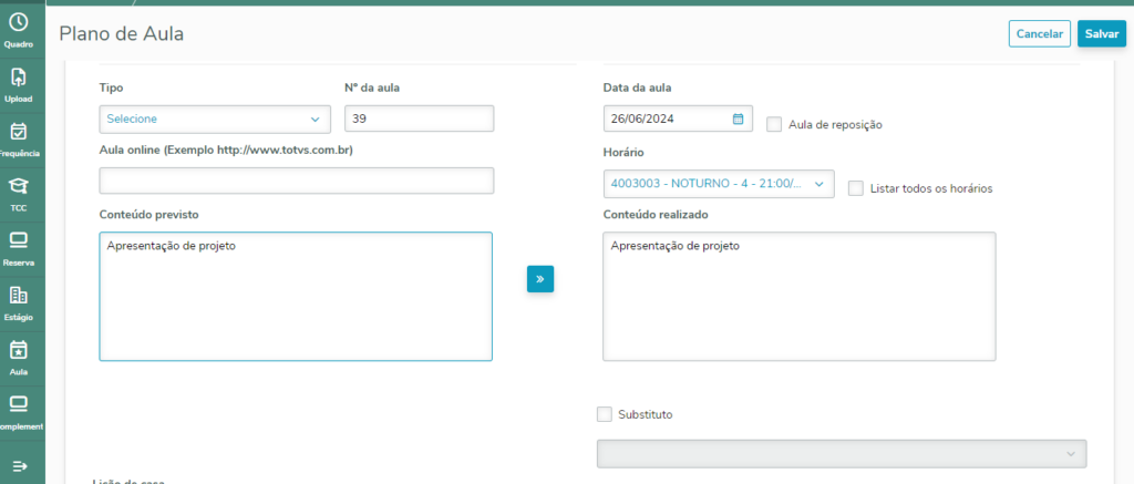 - Habilite o campo “Substituto” quando houver a necessidade de outro professor substituir a o professor responsável pela disciplina