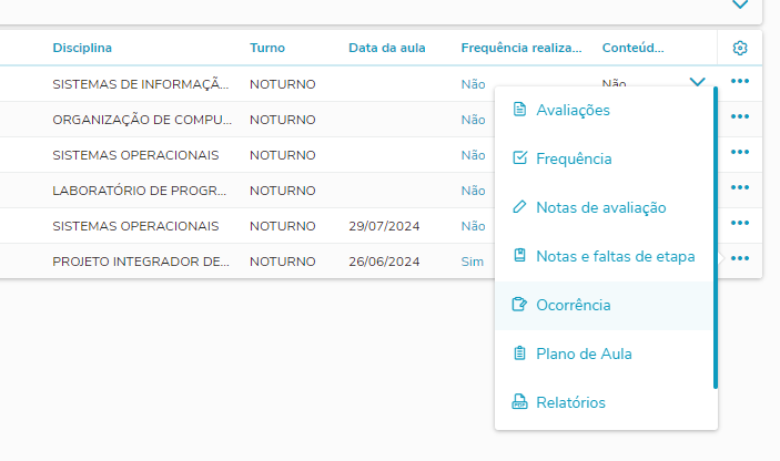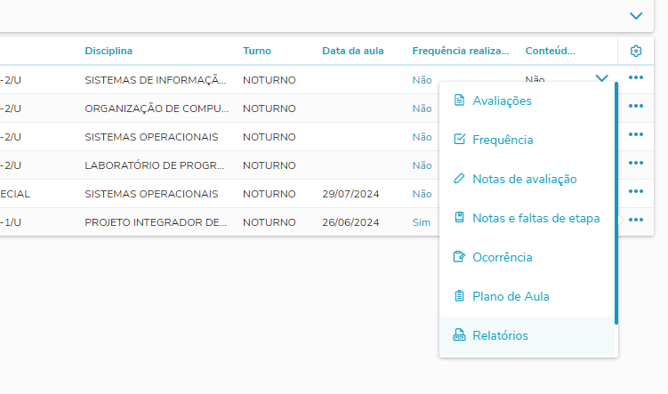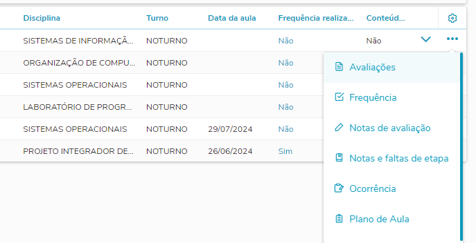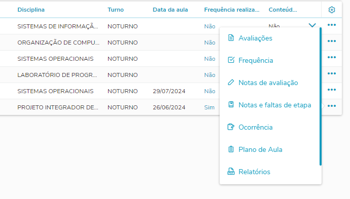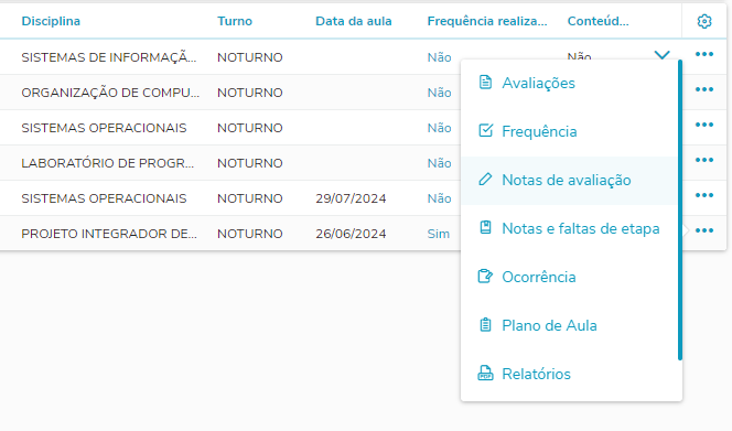 Ao selecionar a opção acima, serão apresentadas as respectivas disciplinas do professor, onde deverá ser realizado o cadastro das avaliações, o registro de frequência, lançamento de notas, visualização de relatórios de notas e faltas por etapa, registro de ocorrências, lançamento do plano de aula e a visualização de relatórios gerais