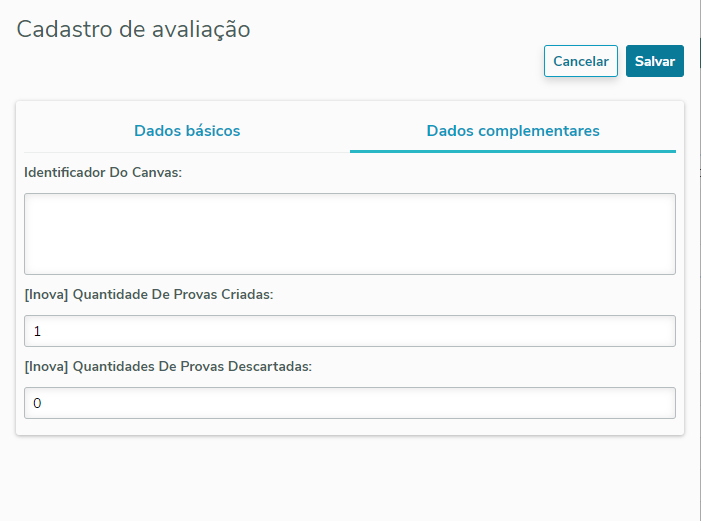 Aba de preenchimento necessário somente para cursos de modalidade Inova, informando a quantidade de provas criadas e a quantidade de provas descartadas