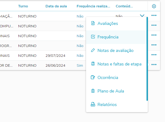 Para realizar a chamada no portal, selecione a disciplina que está sendo lecionada e escolha a opção “Frequência”