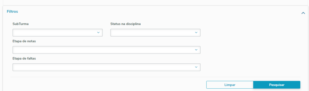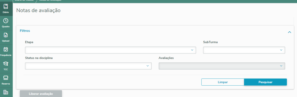 Em seguida, preencha as informações de filtro para realizar o lançamento das notas