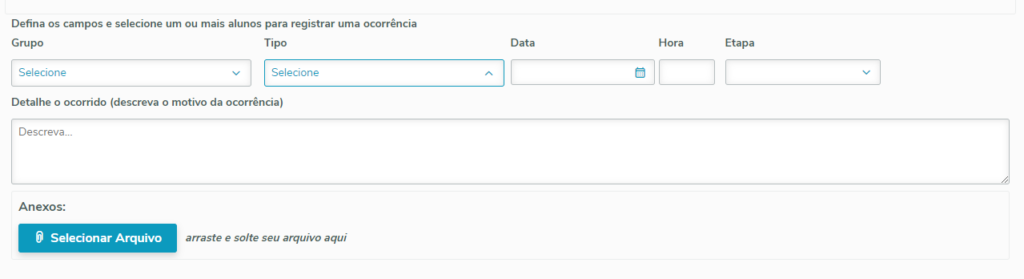 Depois de escolher a opção acima, preencha as informações, selecionando o tipo, informando a descrição, vinculando um arquivo e selecionando o aluno correspondente da ocorrência
