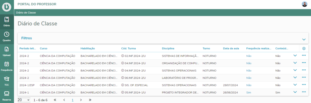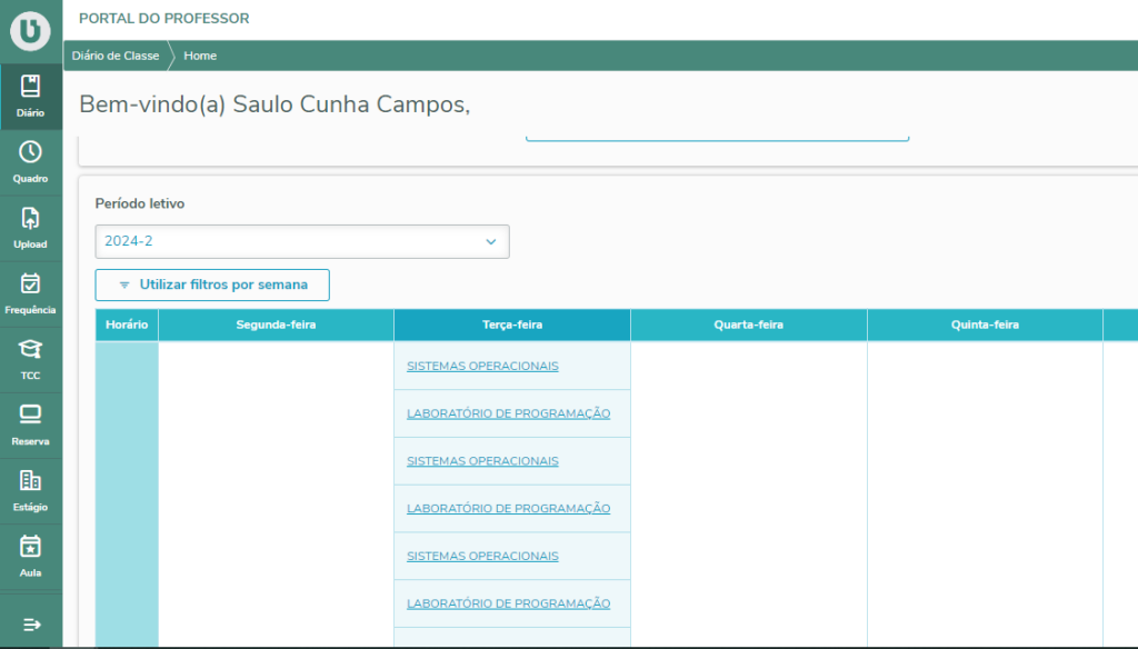 A opção “Diário” é a principal dentro do portal, porque através dela são realizadas diversas funções a respeito da disciplina que será lecionada
