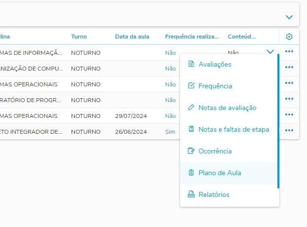 Para realizar o cadastro do plano de aula, clique na opção “Plano de aula” localizada nos três pontinhos no lado direito da tela