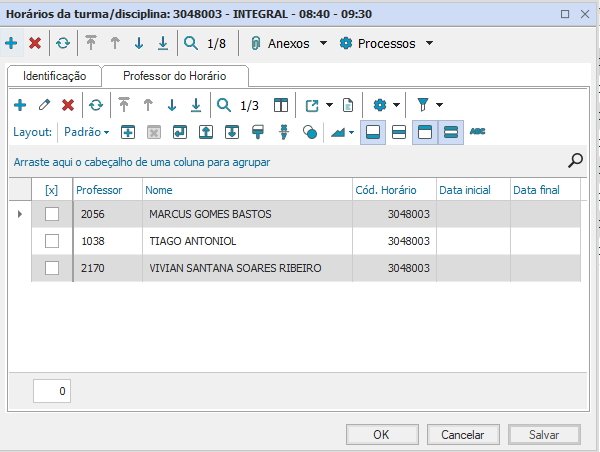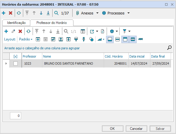 - Para associar o professor em horários da Subturma, é necessário acessar o caminho “Educacional > Currículo e Oferta > Turmas/Disciplinas > Anexos > Subturma > Anexos > Horários da Subturma > Anexos > Professor do Horário”.