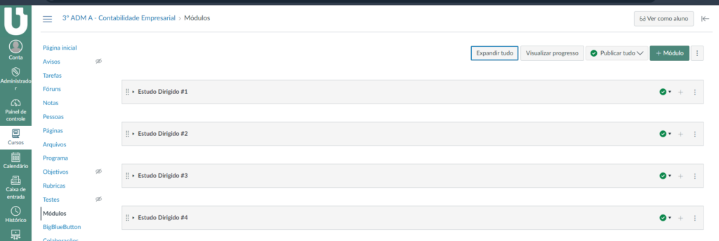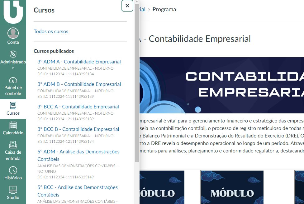 Para criar um estudo dirigido no sistema Canvas, após realizar o login, selecione a opção cursos e escolha a disciplina desejada