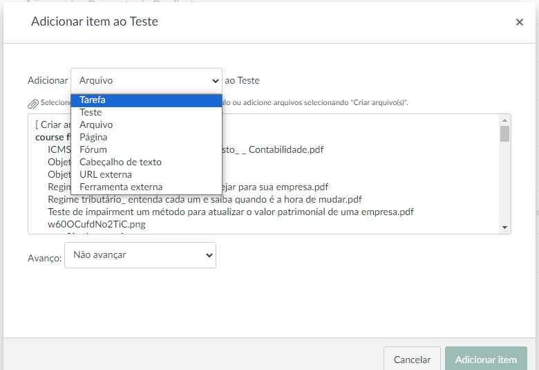 Ao selecionar a opção acima, abrirá uma aba onde deverá ser selecionado o que será adicionado como tópicos