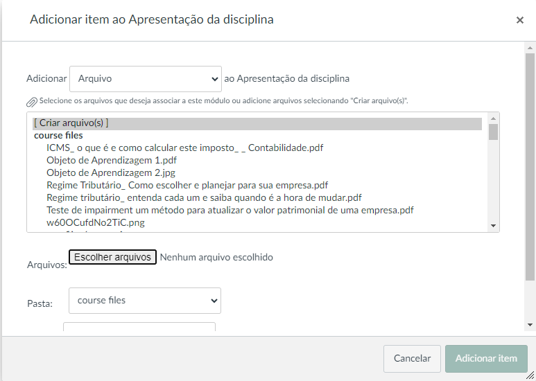 A seguir clique em “Escolher arquivos” selecione o mesmo e finalize em “Adicionar item”