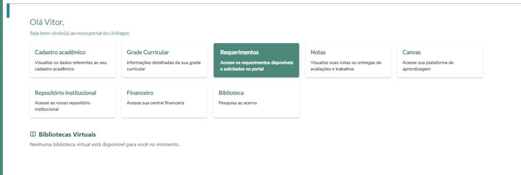 Para efetuar o envio da documentação inicial e dos relatórios de estágio, depois de realizar o login no portal, selecione a opção “Requerimentos” localizada na interface principal