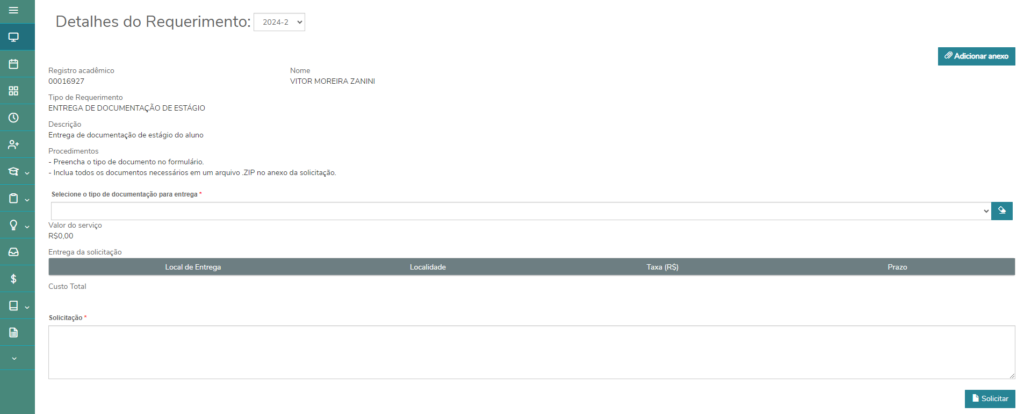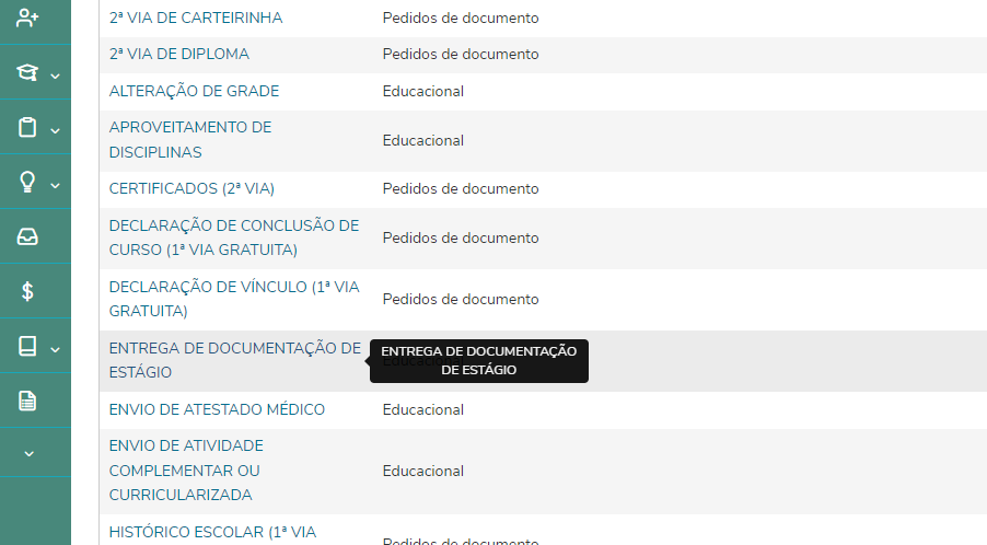Em seguida, escolha a opção “Entrega de Documentação de Estágio” como mostra a imagem abaixo