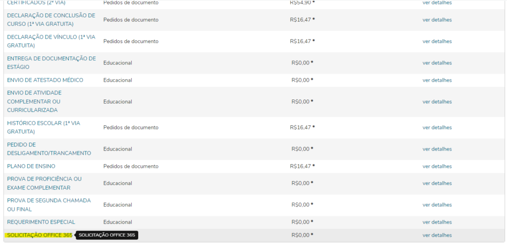 Nessa página será apresentada uma listagem com os requerimentos que podem ser solicitados. Você deve escolher o requerimento SOLICITAÇÃO OFFICE 365.