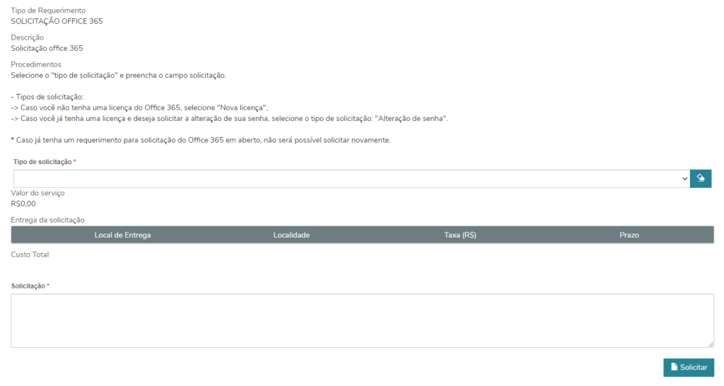 Após preenchimento das informações, basta clicar em Solicitar para registrar o pedido.
