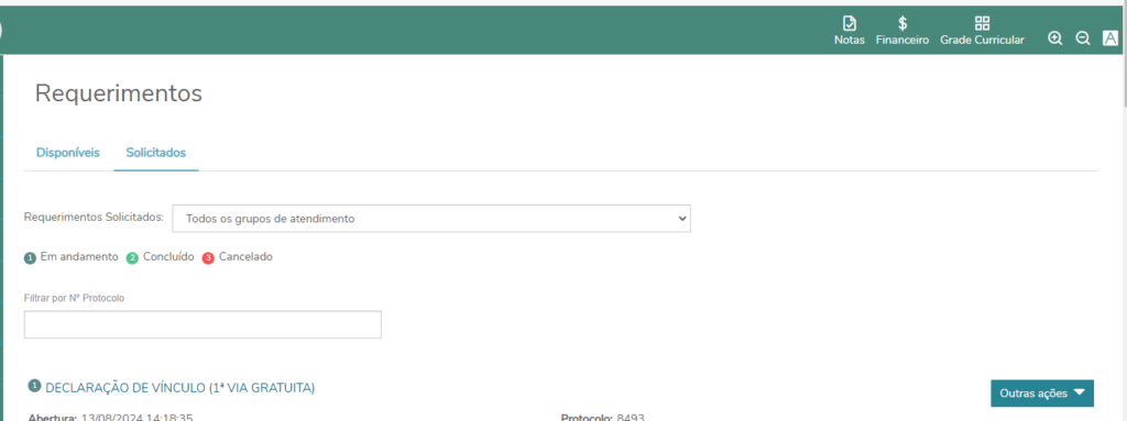 Sua solicitação estará disponível para consulta na aba Solicitados da página de requerimentos. (Imagem 5)