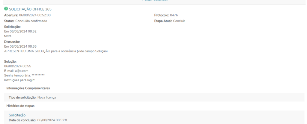 Seu e-mail de login, senha temporária e instruções necessárias para ativação do benefício estarão disponíveis na Solução do requerimento assim que for concluído pela nossa equipe. (Imagem 6)