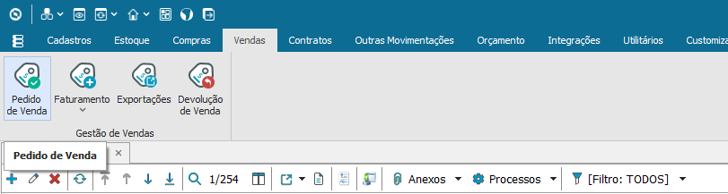 O movimento de previsão do contrato de Recebimento fica no “Módulo BackOffice- Gestão de Estoque, Compras e Faturamento” aba “Vendas” opção “Pedido de Venda”