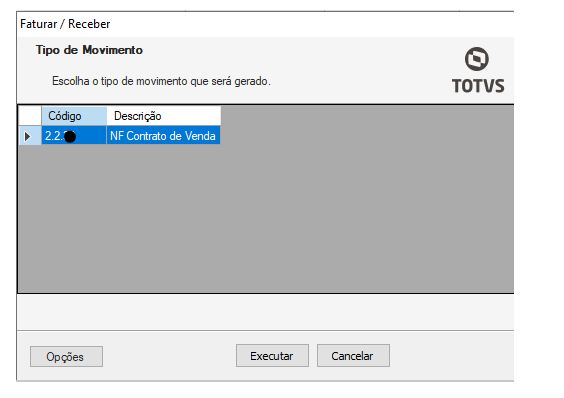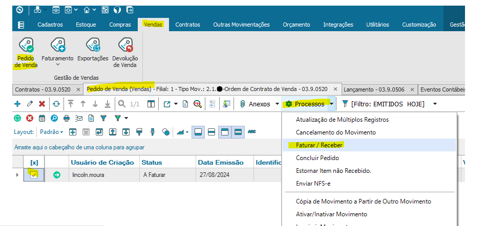 Selecione o movimento correspondente e clique na opção “Processos- Faturar / Receber”