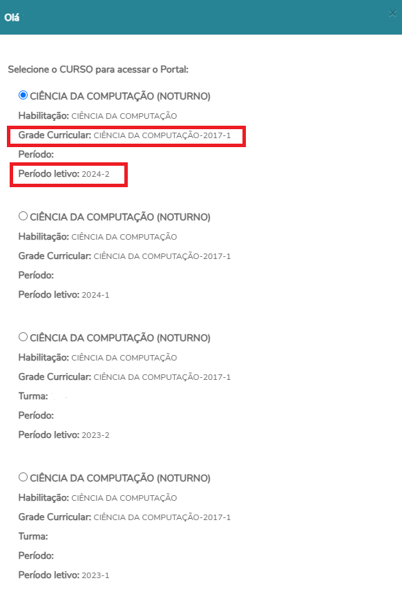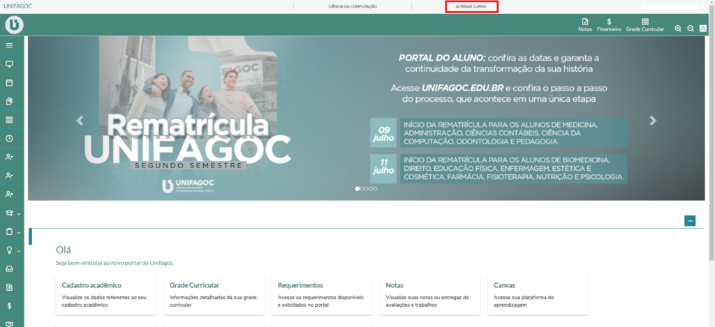 Para isso, é necessário clicar na opção de Alterar Curso(Imagem 1) presente na parte superior da tela principal do Portal do Aluno e, após, selecionar a opção(Imagem 2) que corresponda à matriz e ao período letivo correto.