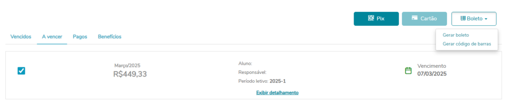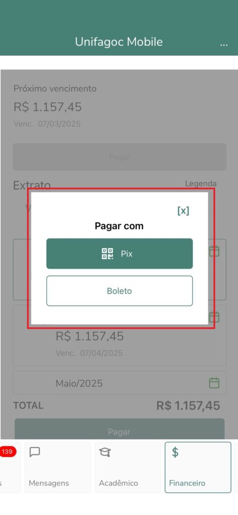 Ao selecionar um dos títulos listados, o sistema destaca as forma de pagamento disponíveis para ele. No exemplo abaixo podemos observar as opções de Pix e Boleto Bancário. Clique na opção de pagamento: