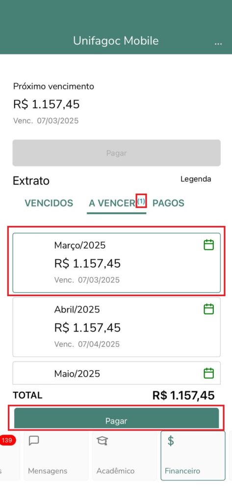 É necessário selecionar o título que pretende realizar o pagamento. Note na imagem abaixo que é exibido um número de títulos selecionados e também um contorno verde no que foi selecionado para o pagamento.