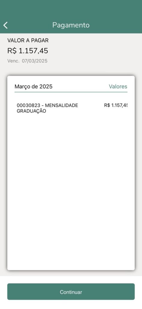 Caso seja selecionada a forma de pagamento “Boleto”, o sistema exibirá um resumo do título selecionado para pagamento e, ao clicar em “Continuar”, será exibida a linha digitável para pagamento do boleto do título.