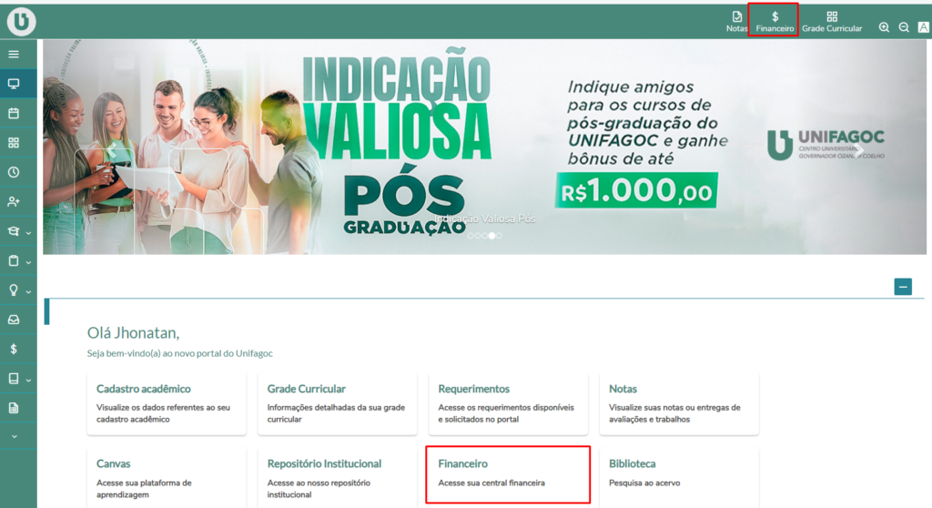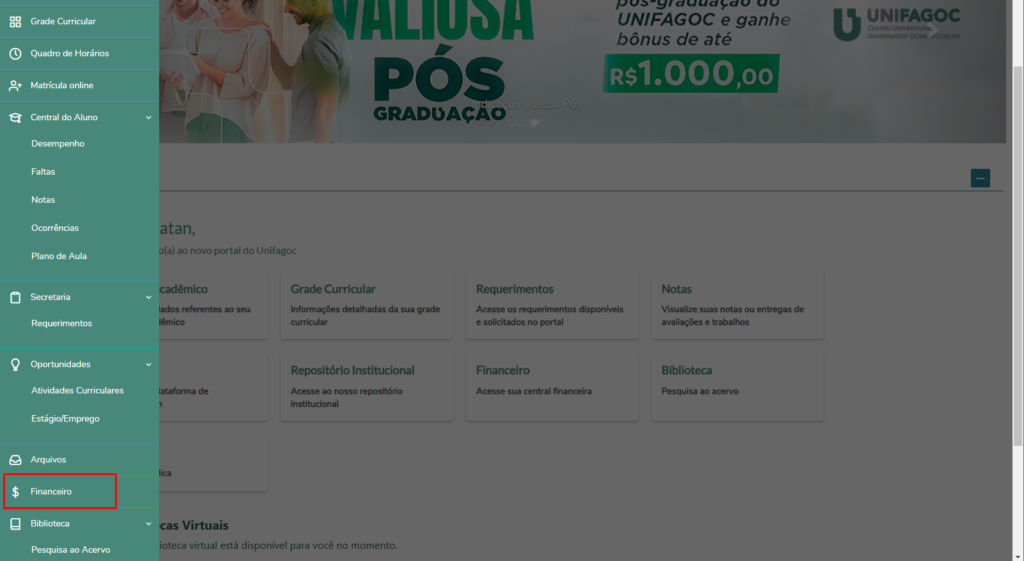Na tela inicial do Portal do Aluno, temos 3 opções de acesso aos registros financeiros, como pode observar pelas imagens abaixo: