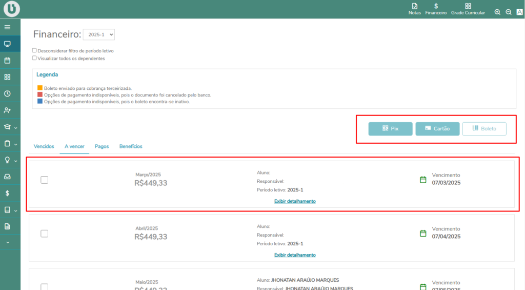 Ao acessar o menu Financeiro, serão listados todos os títulos do aluno no semestre selecionado. Como pode observar na imagem abaixo, o sistema exibe o valor de cada título e as formas de pagamento.