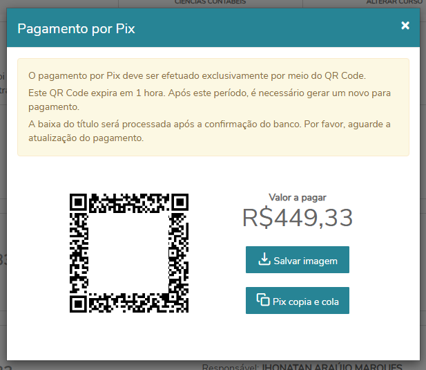 Caso a forma de pagamento selecionado seja “Pix”, será exibido uma QR Code para pagamento, uma opção de “Copiar QR Code” para ser aplicada na opção de pagamento por “Pix copia e cola” nos aplicativos de banco e uma opção de compartilhamento do QR Code.