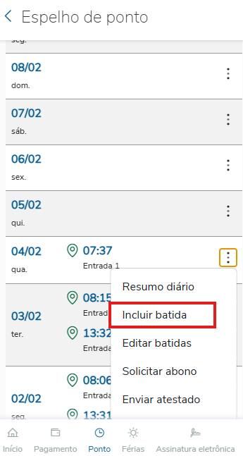 Clique no botão de ações e selecione a opção Incluir batida.