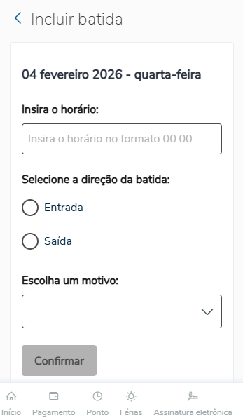 Para realizar a inserção de batidas manuais através do app/portal Meu RH, siga os passos abaixo: