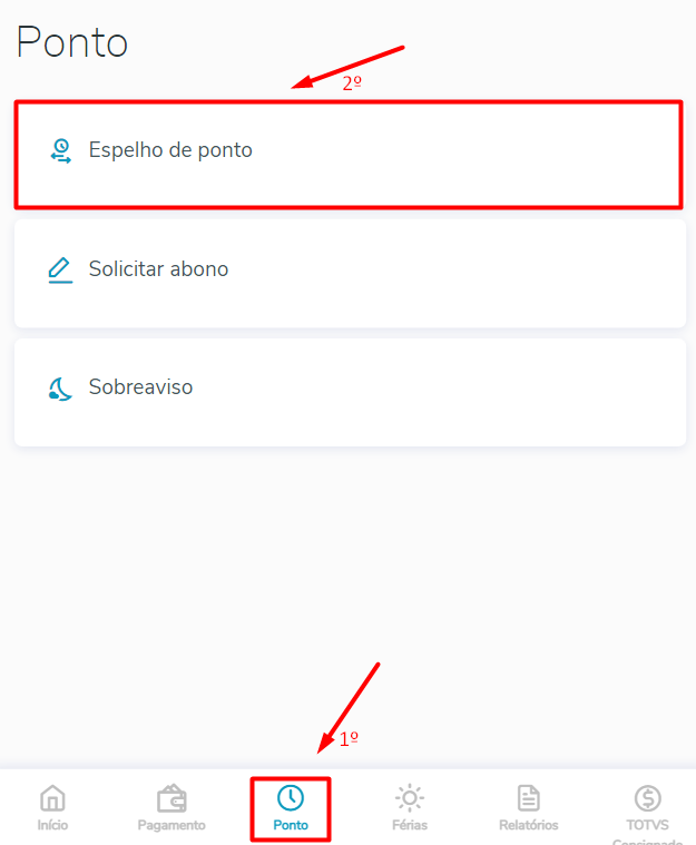 Acesse o app Meu RH, selecione o menu Ponto e a opção Espelho de ponto.