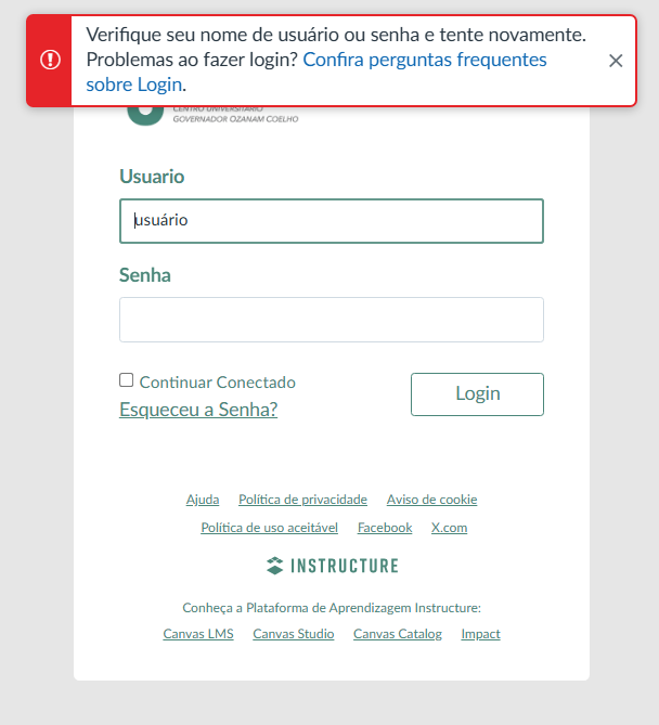 A mensagem de erro do Canvas é genérica e ampla. Os dados de login do Canvas devem ser os mesmos usados para acessar o Portal do Aluno.