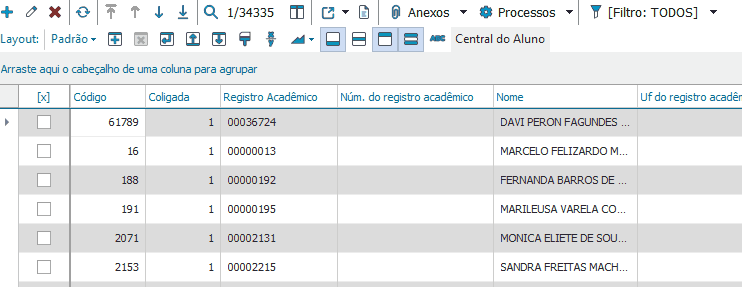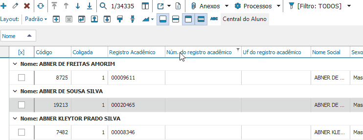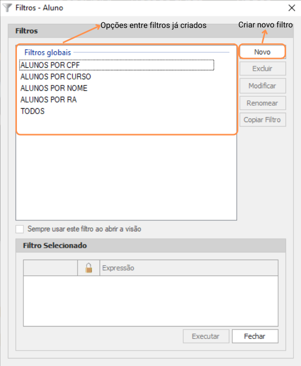 O filtro é sempre utilizado em cada atividade, função ou área do sistema. Eles podem ser criados com base nas preferências ou necessidades do usuário, mas é importante que sejam utilizados elementos obrigatórios (em negrito), para que não corra o risco de abrir uma tabela faltando algum item (aluno, por exemplo):