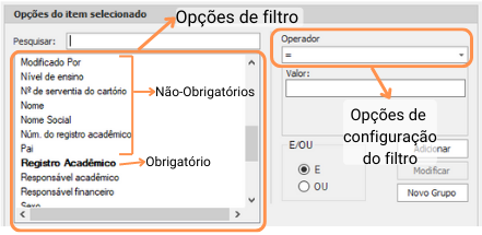 Os operadores oferecem formas de personalização do filtro selecionado e o “Valor” define as especificações do operador. Em alguns casos o capo “Valor” pode ser deixado em branco, à depender do operador selecionado.