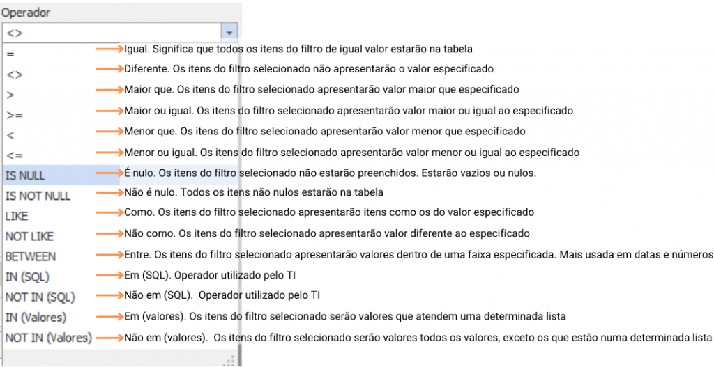 O operador define permite configurar limitantes para o filtro, se ele incluirá todos os elementos da tabela ou apenas alguns. Os operadores estão em inglês, por isso é necessário saber o significado de cada um ao empregá-lo.