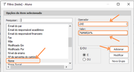 Utilizado quando se quer apresentar todos os registros que contenham determinado nome, código, etc. ou parte dele. O valor desse filtro deve apresentar esse nome ou código. Se o objetivo, por exemplo, é localizar na área “Alunos” todos os alunos com parte do nome “Maria”, deve-se selecionar “Nome” nas opções de filtro, definir o operador como “LIKE” (como), preencher o valor com “%MARIA%”, Adicionar e salvar. Ao executar o filtro, aparecerão todos os alunos com “Maria” em alguma parte do nome.