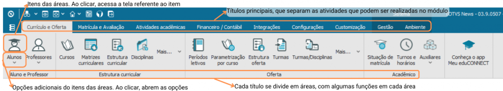 Alguns módulos são subdivididos em áreas, que melhor setorizam as atividades realizadas dentro do Sistema. Os itens localizados no mesmo módulo tem relação, mas são atividades diferentes e, por isso, são subdivididas: