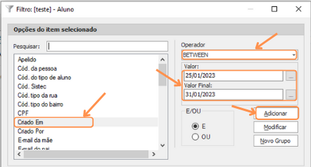 Utilizado quando se quer apresentar os registros dentro de um intervalo, por isso é mais comumente empregado na pesquisa de números ou datas. Na área “Alunos” é possível, por exemplo, localizar todos os registros criados entre duas datas, selecionando-se “Criado Em” nas opções de filtro, definir o operador como “BETWEEN” (entre), preencher os valores com as datas inicial e final do intervalo, Adicionar e salvar. Ao executar o filtro, aparecerão todos os alunos com registro criado nesse intervalo entre as datas.