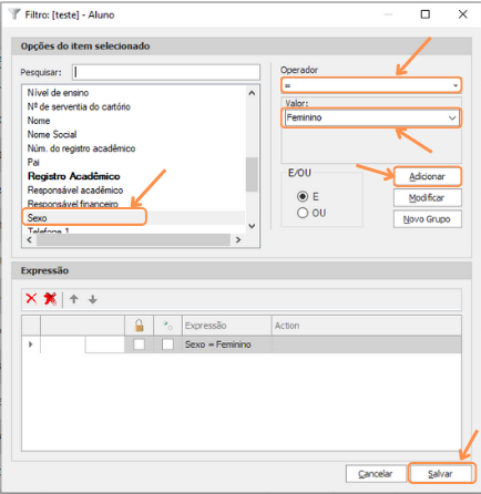 Utilizado quando se quer encontrar dados específicos. O valor definido neste filtro será igual ao valor encontrado. Se a intenção, por exemplo, é localizar na área “Alunos” todos os alunos do sexo feminino, deve-se selecionar “Sexo” nas opções de filtro, definir o operador como “=” (igual), preencher o campo valor com o texto “Feminino”, Adicionar e salvar. Ao executar o filtro, aparecerão todas as alunas do sexo feminino.