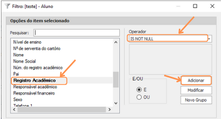 Utilizado quando se quer apresentar todos os registros para a opção de filtro selecionada. Não se deve preencher o valor desse filtro, porque ele engloba todos os itens não nulos, ou seja, todos os itens que tenham sido preenchidos na referida tabela do filtro. Se o objetivo, por exemplo, é localizar na área “Alunos” todos os alunos, deve-se selecionar um item de preenchimento obrigatório (em negrito) nas opções de filtro, definir o operador como “IS NOT NULL” (não é nulo), Adicionar e salvar. Ao executar o filtro, aparecerão todos os alunos cadastrados.
