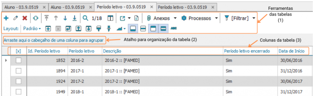 - É possível abrir tabelas de áreas e contextos diferentes simultaneamente, mas esse comportamento não é indicado, pois não existe nenhuma diferenciação entre tabelas de diferentes contextos, o que poderia resultar em lançamentos em filiais ou níveis de ensino incorretos.