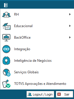 O módulo corresponde a área que o usuário tem acesso dentro do Sistema, seja ele Educacional, RH, Backoffice, Integração, Inteligência de Negócios, Serviços Globais ou TOTVS Aprovações e Atendimento. Os módulos disponíveis para cada usuário irão depender da função que este usuário executa dentro do Sistema e do seu nível de acesso.