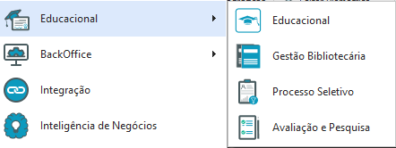 Ao definir corretamente o módulo e contexto, o usuário é apresentado à interface do módulo Educacional, que agrupa as funções sob diferentes títulos, que abrem um conjunto de itens, correspondentes à cada função do sistema: