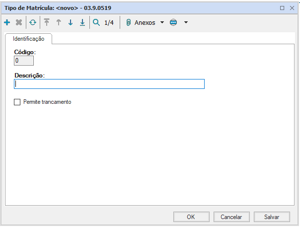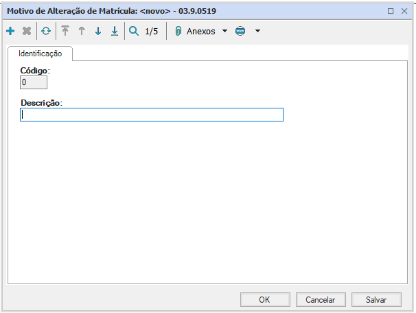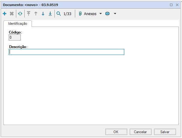 Esse cadastro é utilizado apenas como banco de dados e apresenta código e descrição como campos à serem preenchidos.
