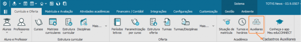 As tabelas Auxiliares ficam na área de “Currículo e Oferta”, Em “Acadêmico”: