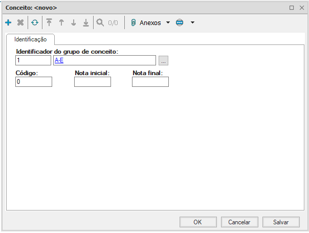 No cadastro de conceito é necessário vincular ao grupo de conceito, definir um código para o conceito, uma nota inicial e final e salvar.