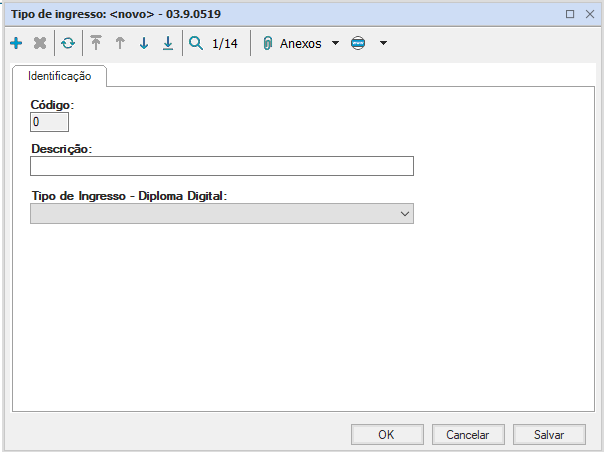 Apresenta código, de criação automática em ordem numérica de cadastros, descrição, que é o nome utilizado internamente para o tipo de ingresso do aluno e a seleção do tipo de ingresso de acordo com as opções padrão definidas para o Diploma Digital.
